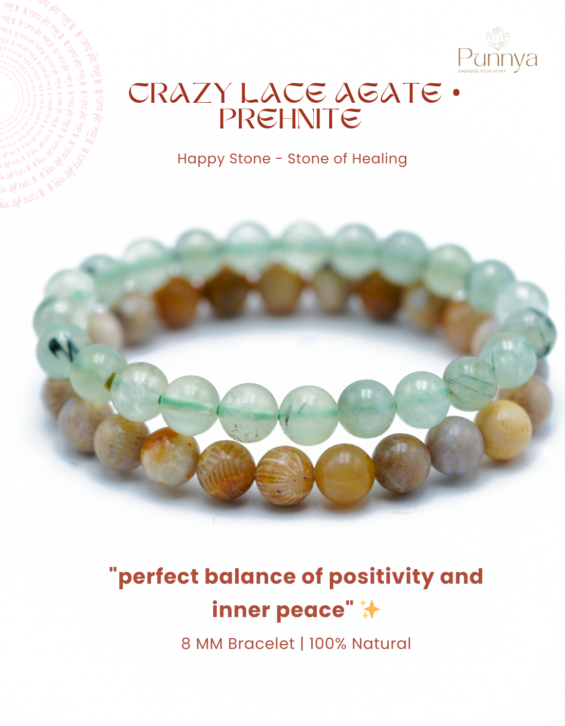 Together, Crazy Lace Agate and Prehnite create a perfect balance of positivity and inner peace. This powerful duo encourages happiness, stress relief, emotional stability, and deep healing energy.