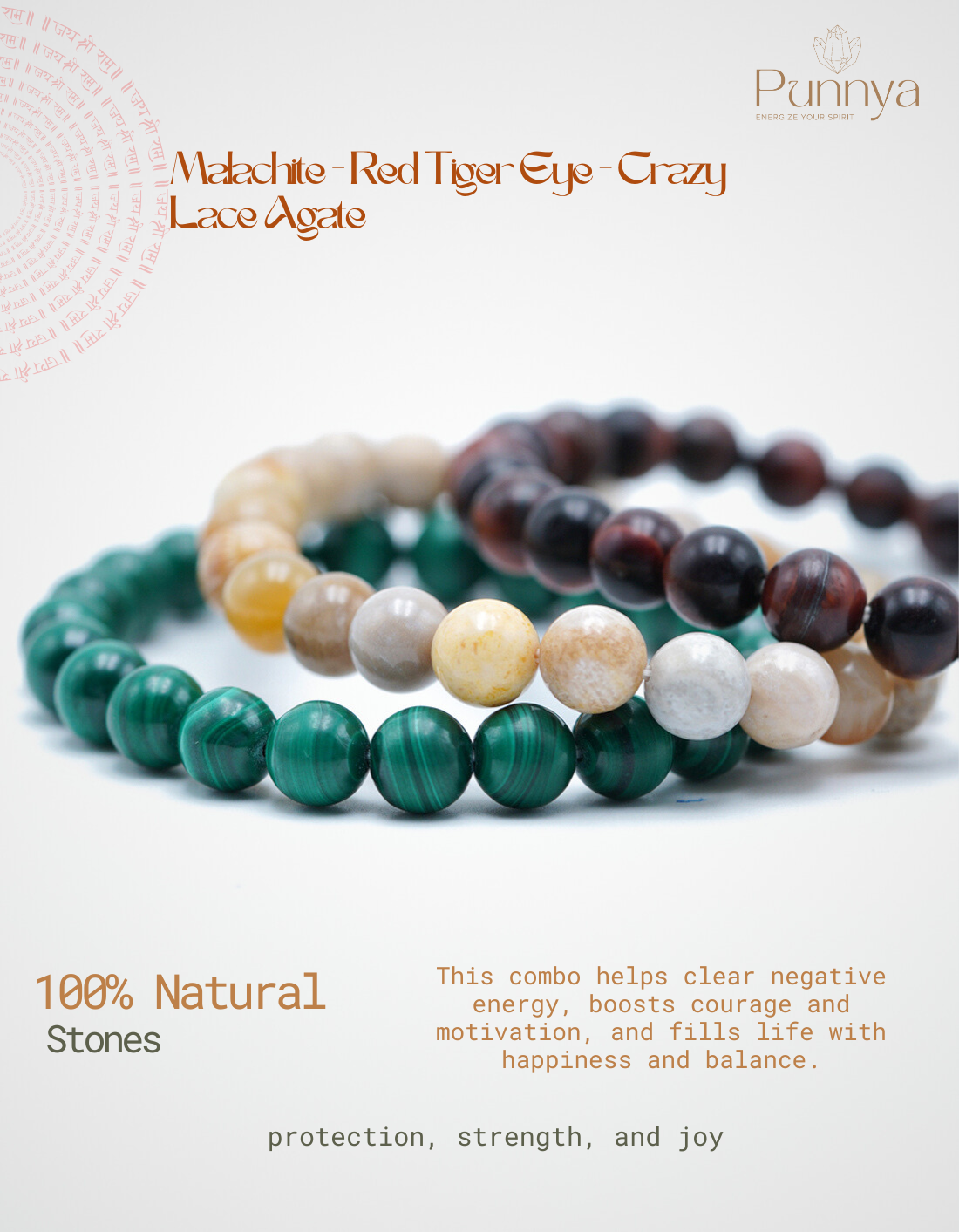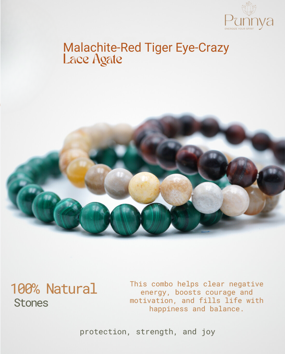 Together, Malachite, Red Tiger Eye, and Crazy Lace Agate create a powerful trio of protection, strength, and joy. This combo helps clear negative energy, boosts courage and motivation, and fills life with happiness and balance. Perfect for those who want to stay strong, positive, and emotionally stable while embracing transformation.